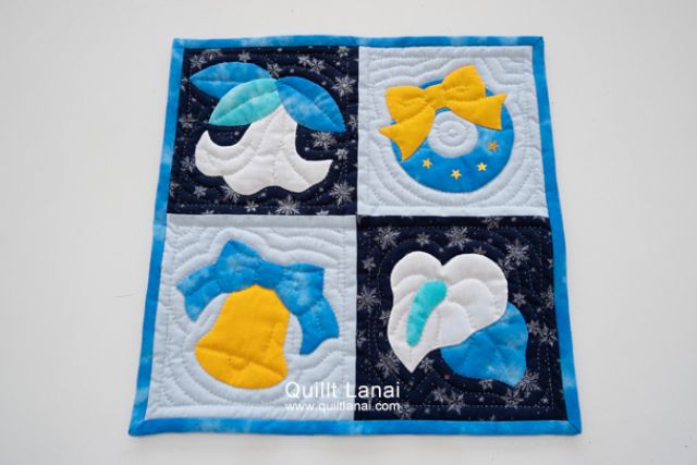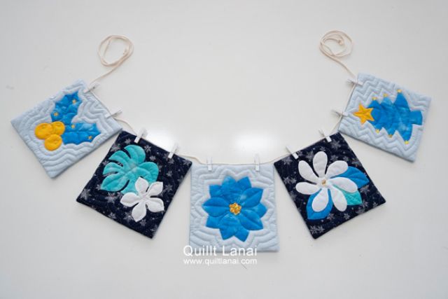 2025年のクリスマスタペストリーもうひとつは4枚つなげたパッチーワーク風のミニタペストリーと一枚ずつ仕立てるガーランド風のハワイアンキルトです。