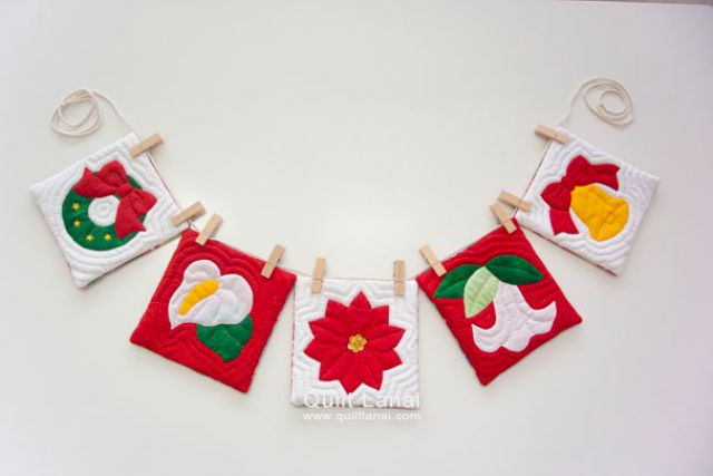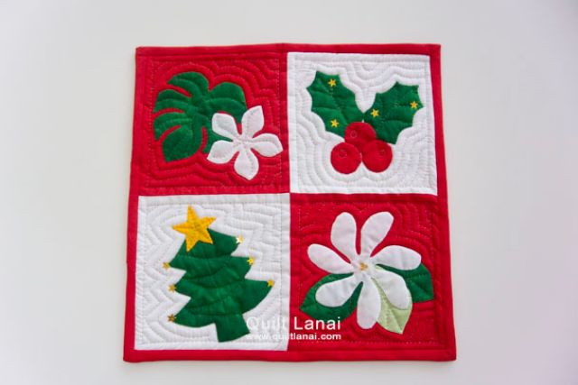 2019年のクリスマスタペストリーもうひとつは4枚つなげたパッチーワーク風のミニタペストリーと一枚ずつ仕立てるガーランド風のハワイアンキルトです。