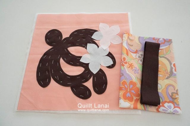 アップリケしやすいと好評な大きいホヌとプルメリアのミニクッションのしつけ済みキットです。